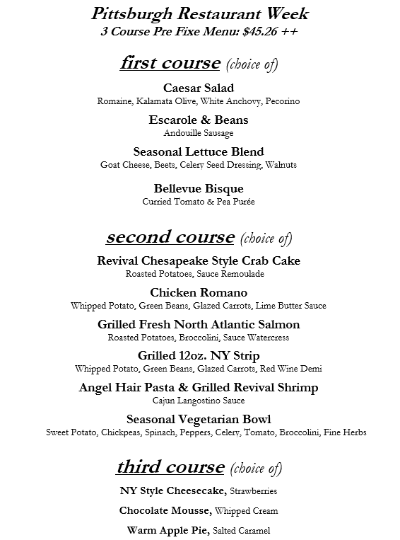 Winter 2026 Restaurant Week: January 9th-10th, January 14th-17th, January 23rd-24th Friday, January 9, 2026 5:00 PM 17:00 Saturday, January 24, 2026 10:00 PM 22:00 Revival on Lincoln 366 Lincoln Ave Bellevue, PA 15202 United States (map) Google Calendar ICS Menu subject to change based upon availability. RESERVATIONS